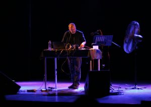 Uno de los show principales de esta jornada fue protagonizado por Mark Vernon, quien después de haber impartido una serie de talleres bajo el alero de la facultad, cerró su visita a Santiago con una presentación de arte sonoro en el Teatro UDLA El Zócalo.
