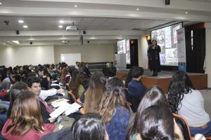 En el auditorio del Campus Providencia y con la presencia de la Directora de la Escuela de Traducción, Marion Zepeda, y más de un centenar de estudiantes y académicos, la expositora presentó la charla denominada “El debate de género en las teorías de traducción”.
