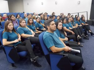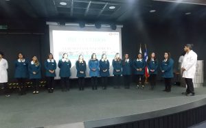Los familiares más cercanos de los estudiantes fueron los encargados de entregarles e investirlos con el delantal característico de la carrera, mientras que, de parte de la Directora de Carrera, Yirda Romero y de la coordinadora de Prácticas Claudia González, recibieron una piocha identificatoria con sus nombres.