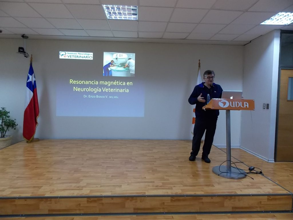 Estoy muy contento de haber venido a UDLA  para hablar de resonancia magnética, que es una herramienta diagnóstica que se está usando mucho en neurología, área a la que me dedico hace más de 20 años. Este es un examen que nos abre un horizonte de diagnósticos espectacular, por eso vine a compartir la utilidad del examen con veterinarios de la zona”, dijo el Dr. Bosco, quien detalló que el resonador magnético es un equipo que se utiliza especialmente en perros, gatos y algunos animales exóticos pequeños.