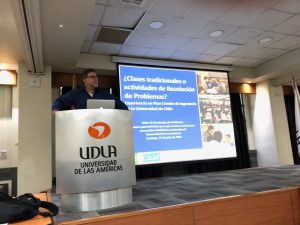 La segunda parte de la jornada consistió en la presentación de 4 experiencias de trabajo colaborativo en el aula de matemática desarrolladas por diferentes instituciones de nivel terciario. Los expositores fueron: Natalia Ruiz con la presentación “Aprendizajes que surgen de la colaboración con la comunidad educativa de la Armada», Cristian Reyes con “Resolución de Problemas, una práctica que poco se práctica. Experiencia en Inacap”, Patricio Felmer :“¿Clases tradicionales o actividades de Resolución de Problemas? Experiencia en Plan Común de Ingeniería de la U de Chile” y Cecilia Herrera con la ponencia “Secuencia didáctica: Una estrategia de aprendizaje en un espacio colaborativo en el aula de la asignatura MAT110. Experiencia Universidad de las Américas”.