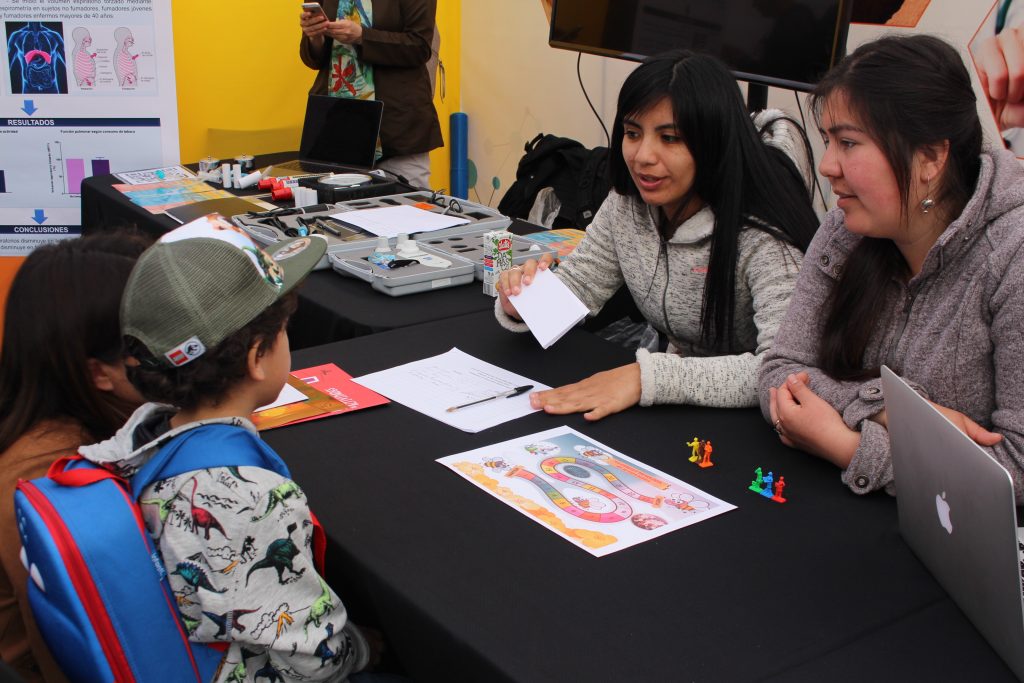 Las estudiantes, docentes y académicas participaron de dos actividades de forma simultánea. La primera tuvo como base la ciencia y la tecnología en nuestras vidas. Para eso, la delegación de UDLA construyó un juego enfocado en niños y niñas de 1° a 6° básico y sus familiares, donde mediante preguntas reflexionaron en relación a la ciencia y la tecnología en actividades cotidianas que realizan.