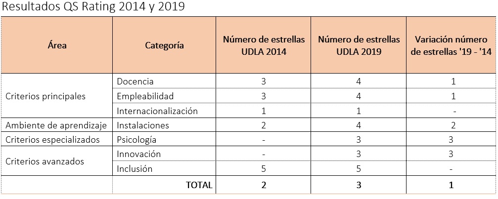 Para optar a esta clasificación, UDLA se sometió a una auditoría académica en áreas clave de la gestión de la universidad como docencia, infraestructura y equipamiento, empleabilidad de los graduados, inclusión, entre otros, obteniendo tres estrellas a nivel general.