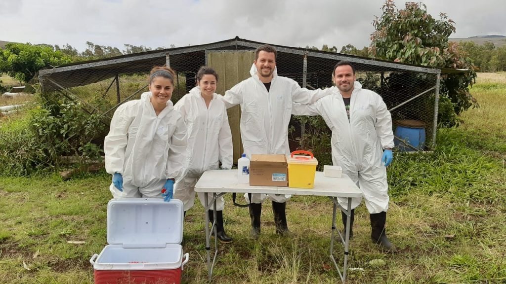 Como parte de este trabajo, la profesional realizó una visita a terreno a Rapa Nui. En dicho lugar no solo se tomaron muestras cloacales, traqueales y sanguíneas a aves domésticas mantenidas en sistemas productivos de traspatio, sino que además se visitaron los motus para obtener muestras ambientales de heces frescas de aves migratorias.