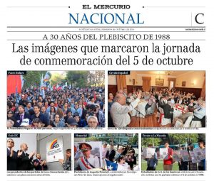 En el marco de la conmemoración de los 30 años del Plebiscito, una delegación de 40 alumnos de primer y segundo año de la carrera de Periodismo, protagonizaron la intervención “1988: Portadas que marcaron la historia”, la que consistió en sacar a la calle emblemáticas primeras planas de diarios chilenos los que mostraban los resultados de la histórica consulta.